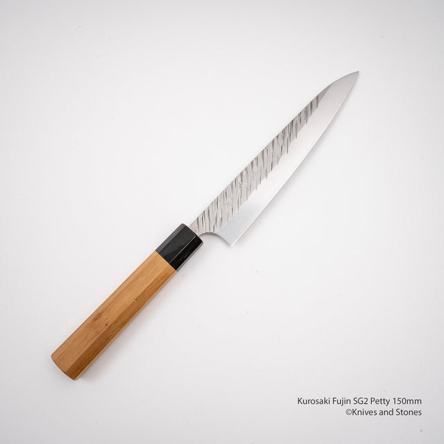 黑崎風神(Kurosaki Fujin)擁有黑崎獨特的對角線鍛造的錘紋圖案,名為「風神」(Fujin)。其視覺效果極具吸引力,加上黑崎卓越的切割技術以及罕見的SG2粉末鋼,使得這款變體備受追捧。黑崎以三款標誌性的錘紋圖案而聞名:雫(Shizuku)、風神(Fujin)和雷神索爾(Raijin)。近年來,這三款產品的產量非常少,而且由於黑崎作品的需求量很大,它們也很難買到。我們最近收到了一小批風神,雖然最初的版本使用的是青紙超級(Aogami Super)材質,但這批風神使用的是更受歡迎的武生(Takefu)粉末鋼SG2。
