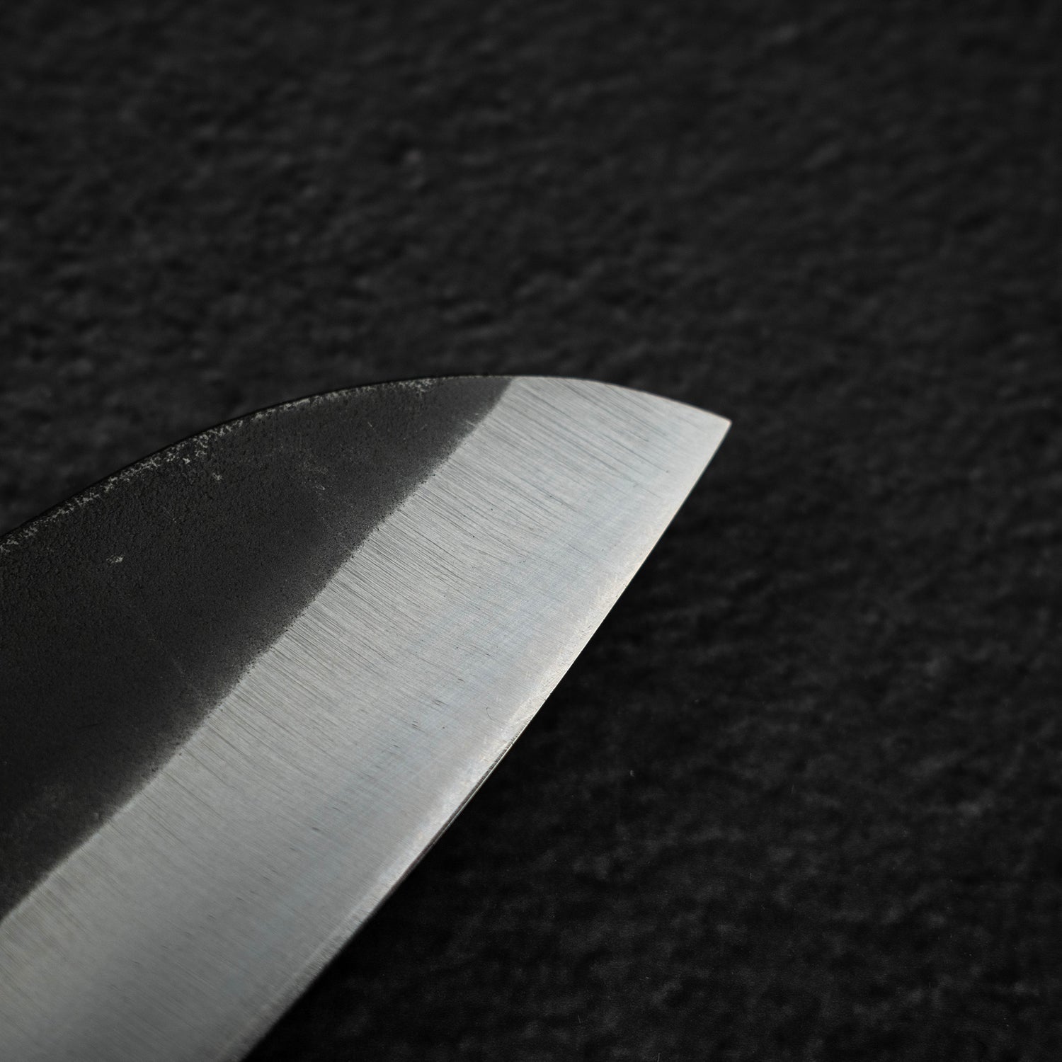 作為一把多用途的「三德」刀,這把三德刀在切肉、剁菜與剁魚方面都表現出色。請注意,刀芯與夾鋼皆為會生鏽的碳鋼;隨著時間會形成獨特的氧化色澤,並需要在使用後立刻沖洗與擦乾以防生鏽。