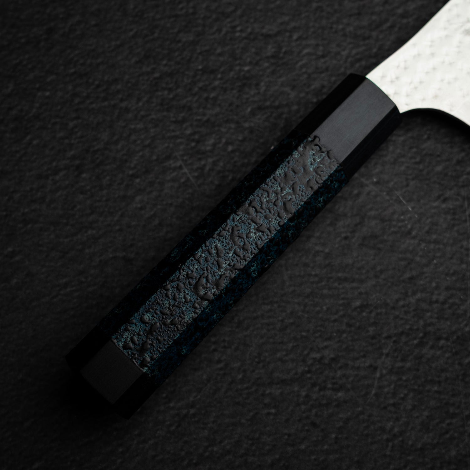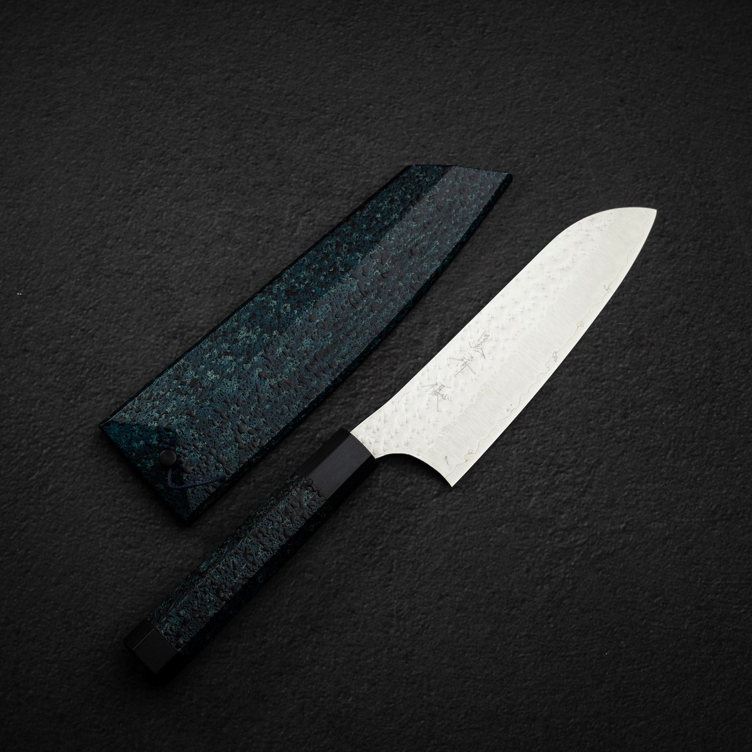 這款 Ai 天目版本真正與眾不同之處,在於其非凡的握柄與對應的刀鞘。兩者皆以天然木材製作,並以「藍染(Ai-zome)」精心染色——這是一種由熟練工匠施作的日本傳統靛藍染色技法。此工藝的良品率極低,使每一件完成的藍色作品都格外稀有且珍貴。再結合「乾漆(Kanshitsu)」等傳統漆藝技法,以及受日本古典陶器釉色啟發的「天目(Tenmoku)」,為作品增添層次、質感與耐久性。