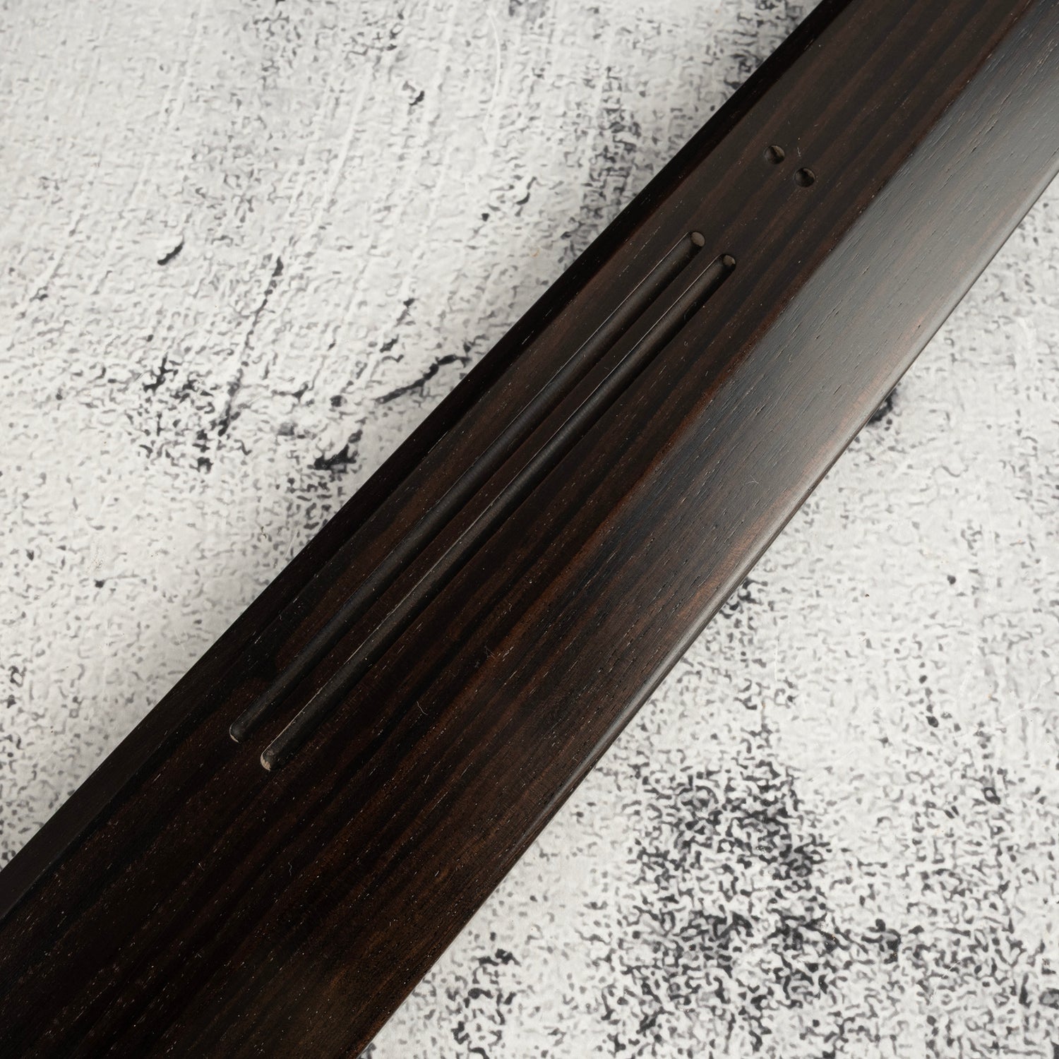 增添其美感的是優雅的血槽(bohi),這是一項源自日本傳統刀劍工藝的精緻細節。此刀配有相襯的黑檀木鞘與八角手柄,兩者皆以緻密、烏黑的硬木精心製作,展現低調奢華與永恆雅致。