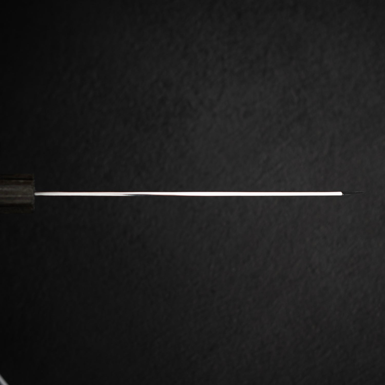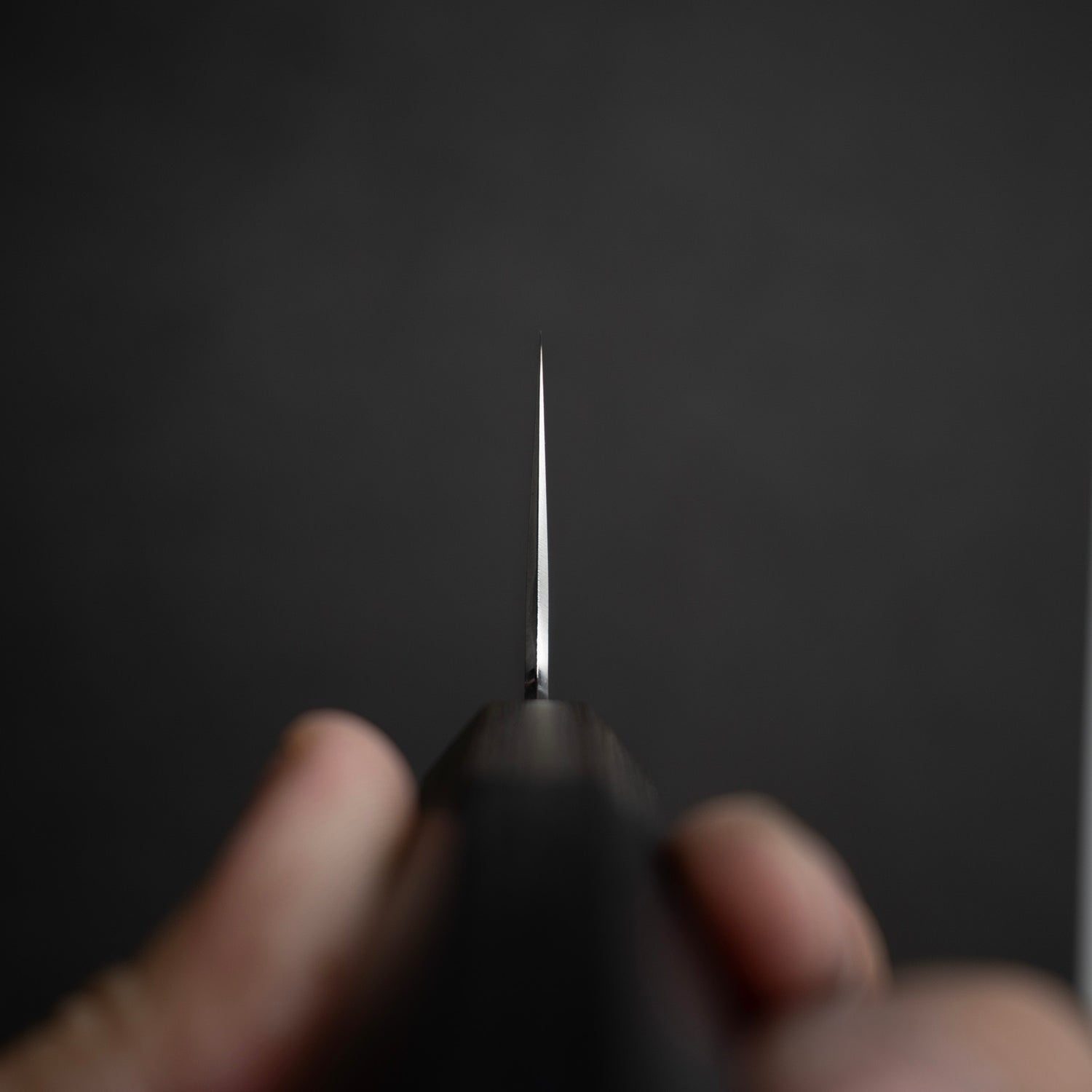Typical Sakai approach in knifemaking would begin with a forged blade with intermediate thickness, sharpening in a lightly convex geometry where the bevel transitions smoothly to the Hira. After the finishing polish using a wooden wheel or sandblaster, the Kasumi finish would look like a uniform surface from the side. Hado took a very different approach in their knife design, staring with a slightly thinner blade that measure just above 2mm in the spine, they put a very aggressive bevel onto the blank, the Shinogi line is clear and defines, located close to the spine, which means a lot of material are removed and the bevel stays thin until very high up. This means minimal wedging in cutting even if you are dealing with a tough produce, and the sticking issue is solved via a subtle convex grind behind the edge.