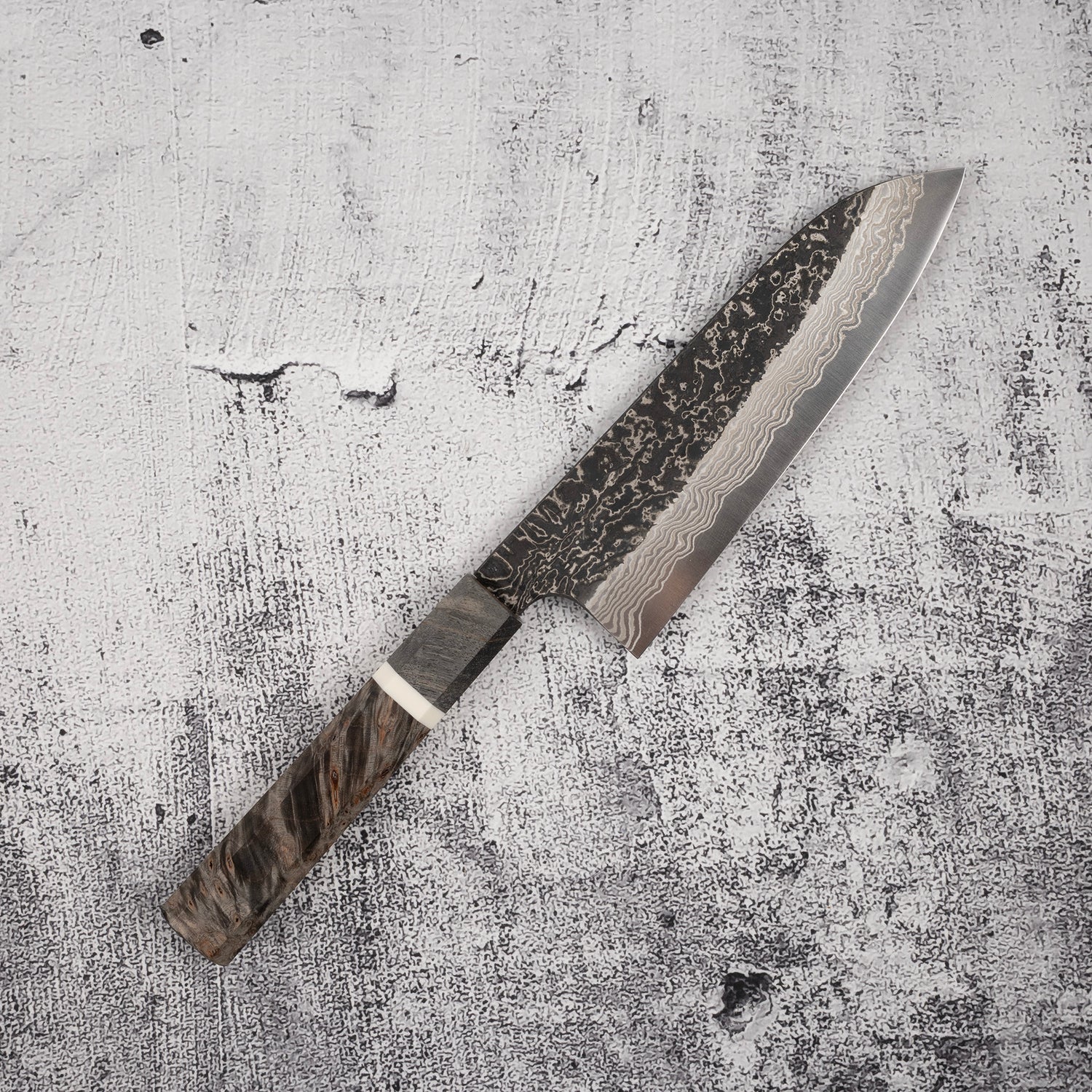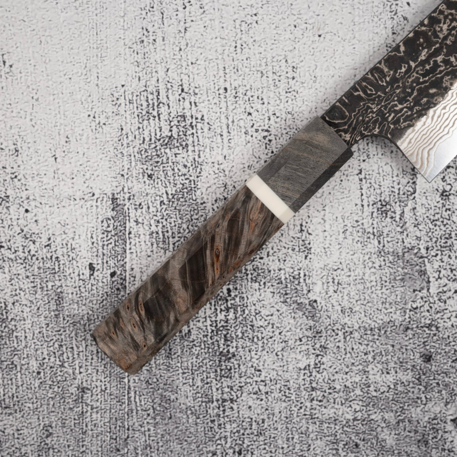 The stabilized birch burl handle adorning the Hatsukokoro chef knife is a testament to both exquisite craftsmanship and natural beauty. Birch burl, prized for its intricate grain patterns and unique textures, undergoes a meticulous stabilization process to enhance its durability and stability, ensuring longevity and resilience against moisture and wear.