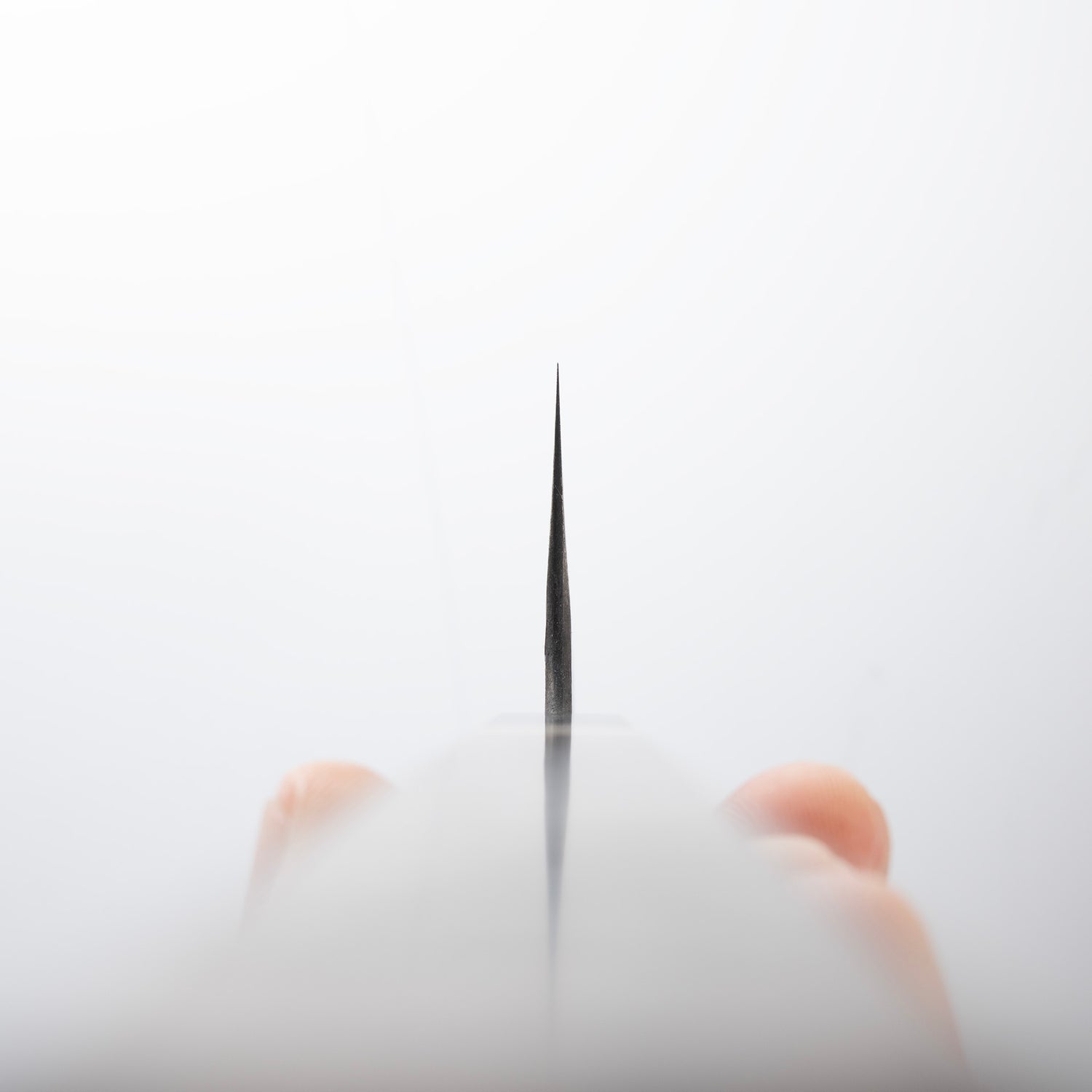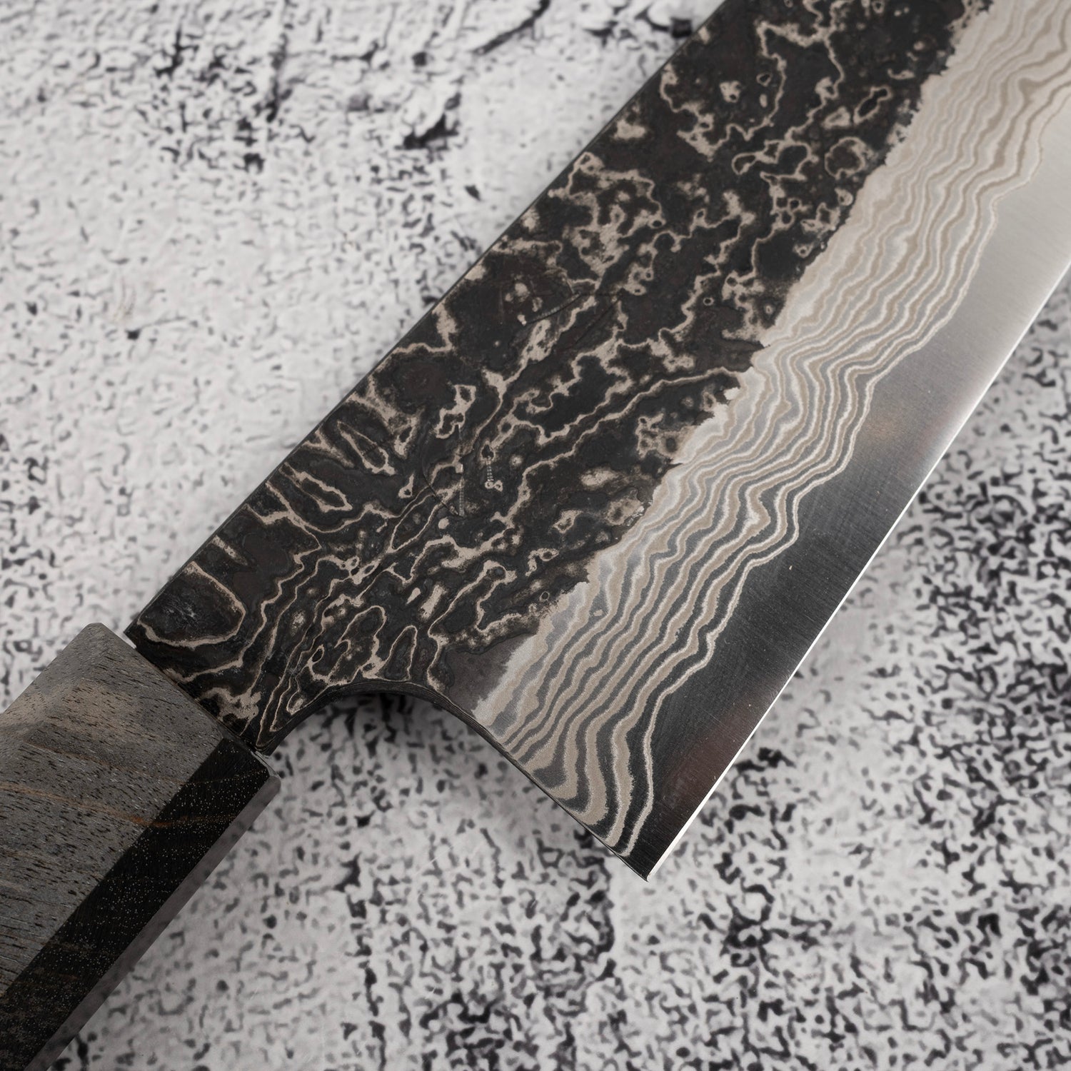 The eye-catching Damascus pattern layed over the Kurouchi finish is probably the most eye-catching feature that grabbed your attention. Unlike most of the Kurouchi finish we see, the oxidation layer on these knives are very dark, It is likely achieved by etching like the Yorokobi SLD line. In contrast, the silver Damascus pattern pops off strongly over teh dark surface, which reminds me of the now-nearly-impossible-to-obtain "River Jump" Tanryusen by Tsukasa Hinoura. I would assume that these knives actually undergone similar process, where the more reactive metal in the Damascus is etched away, leaving the high nickel metal protruding out above the surface, which allows them to be polished after a darker layer of oxidation formed during the heat treating. As these black crust are quite darker and thicker than the typical Kurouchi finish, additional etching are likely done after the polishing to further increase the contrast.