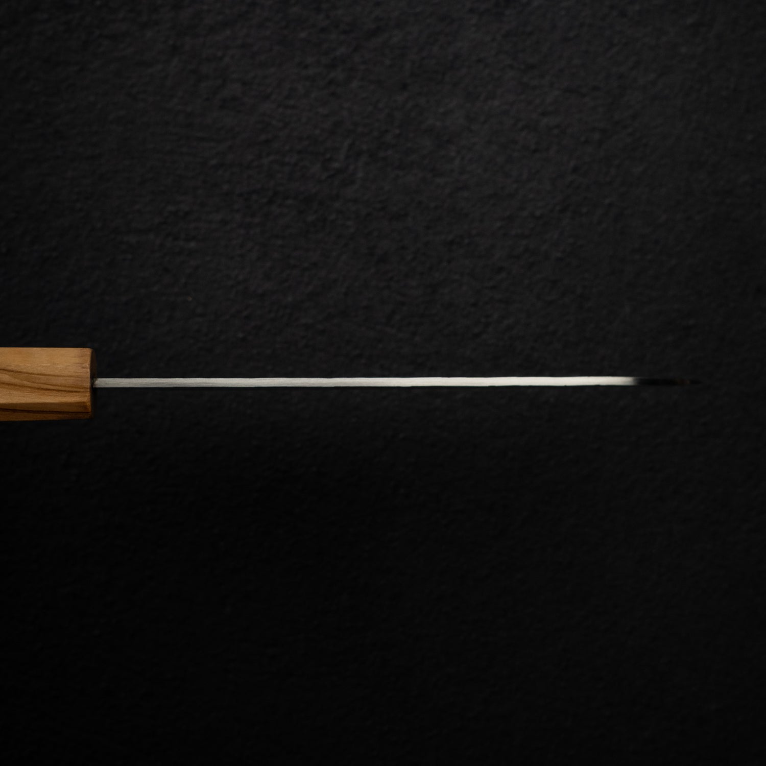 Complementing the blade is a beautifully contoured olivewood handle. Naturally dense and richly grained, olivewood provides a warm, ergonomic grip and unique character—no two handles are alike. Balanced and visually striking, the Strix Santoku embodies performance, durability, and artisan elegance in one cohesive piece.