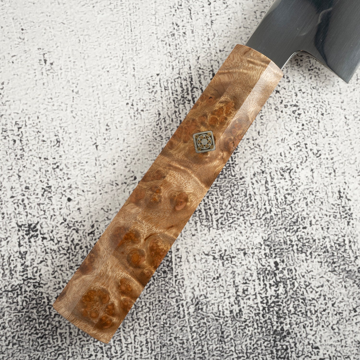 BFCM2025: Rare old stock Yoshikazu Ikeda Honayki Gyuto 240mm, unknown steel so marked as white 3 oil honyaki. Classic wave hamon, comes with with K&S special ordered Myanmar Camphor burl handle and saya set.