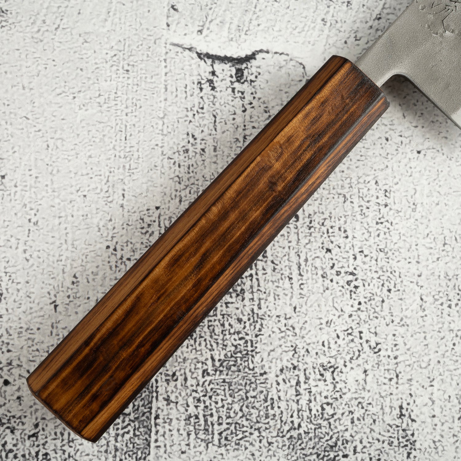 This is a very Sanjo knife under a Sakai brand, and I quite recommend it for users who like that reassuring weight from a heavy knife. The hand forging, rustic Nashiji finish and smooth hand sharpening lead to a very characterful lineup. It is a great line to work with for professionals or knife enthusiasts with its great cutting characteristics.
