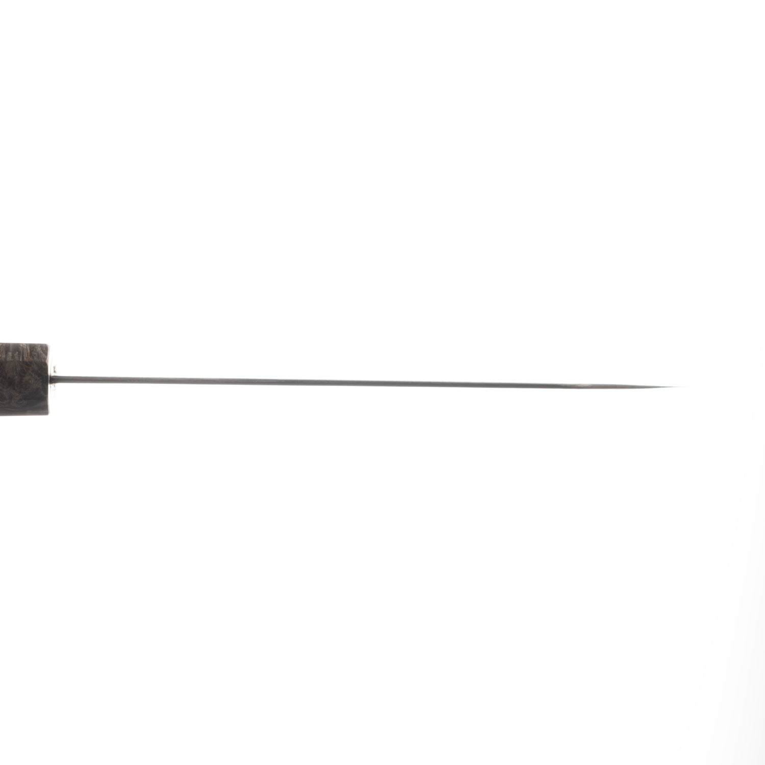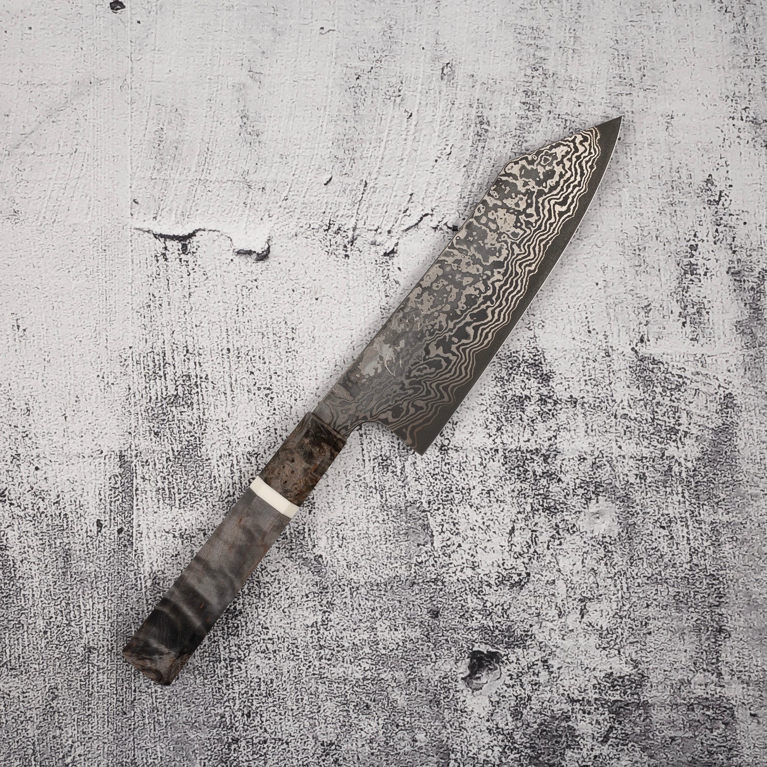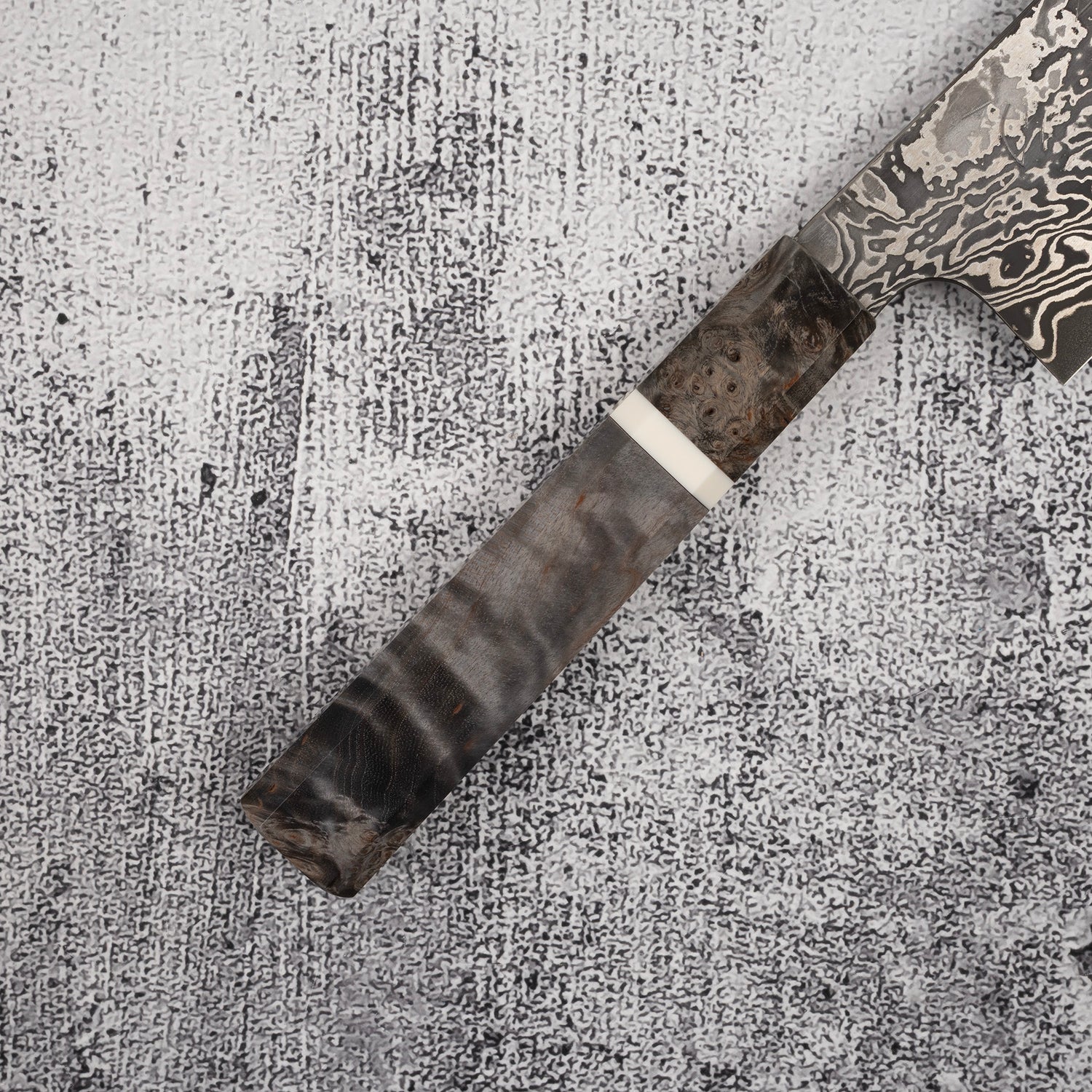 The eye-catching Damascus pattern layed over the Kurouchi finish is probably the most eye-catching feature that grabbed your attention. Unlike most of the Kurouchi finish we see, the oxidation layer on these knives are very dark, It is likely achieved by etching like the Yorokobi SLD line. In contrast, the silver Damascus pattern pops off strongly over teh dark surface, which reminds me of the now-nearly-impossible-to-obtain "River Jump" Tanryusen by Tsukasa Hinoura. I would assume that these knives actually undergone similar process, where the more reactive metal in the Damascus is etched away, leaving the high nickel metal protruding out above the surface, which allows them to be polished after a darker layer of oxidation formed during the heat treating. As these black crust are quite darker and thicker than the typical Kurouchi finish, additional etching are likely done after the polishing to further increase the contrast.