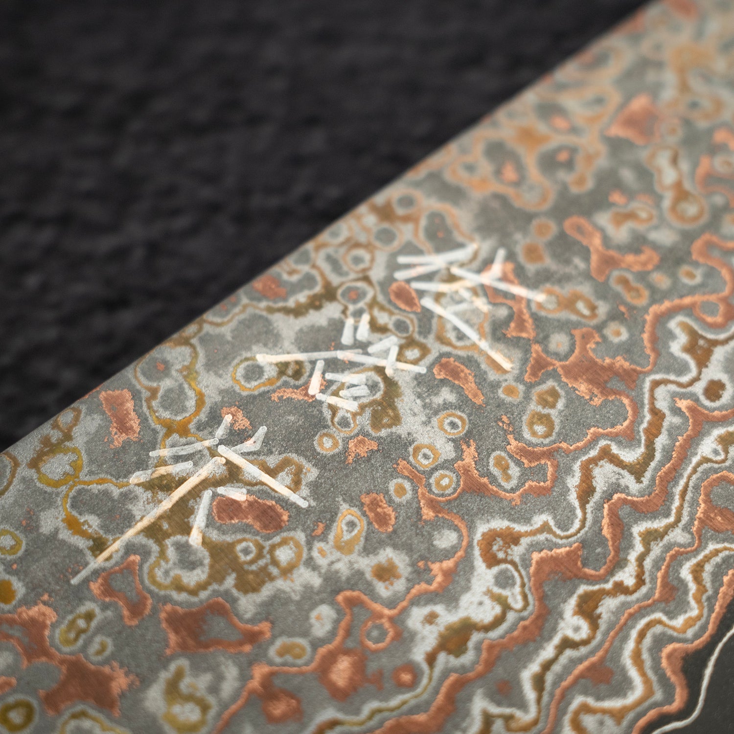Each knife is paired with our signature K&S amboyna burl handle, selected to complement the warm copper and brass tones of the blade. The handle alone has a standalone value of $180, making this piece not only a beautiful performer but also exceptional value.