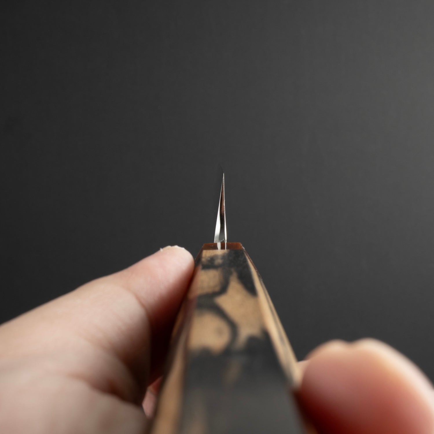 以Aogami #1碳鋼手工鍛造,硬度高達HRc 63–65,擁有卓越的持久鋒利度和輕鬆精確的切割體驗——正是頂尖壽司師傅所要求。鏡面拋光下隱約可見細緻鋼紋,傳統水本燒淬火工藝,則展現出柔和如夢似幻的刃紋,盡顯匠人精神。