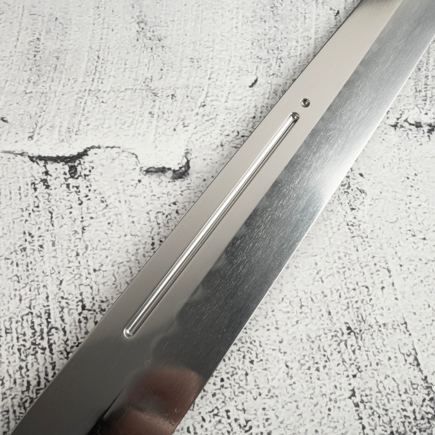 更添美感的是細緻的血槽(bohi),這是受日本刀劍啟發、極為罕見且優雅的細節。此刀配有專屬Pau Rosa木質鞘及相襯的八角柄——兩者皆以紋理豐富的珍稀硬木精製,為純淨鋼材增添溫潤層次。