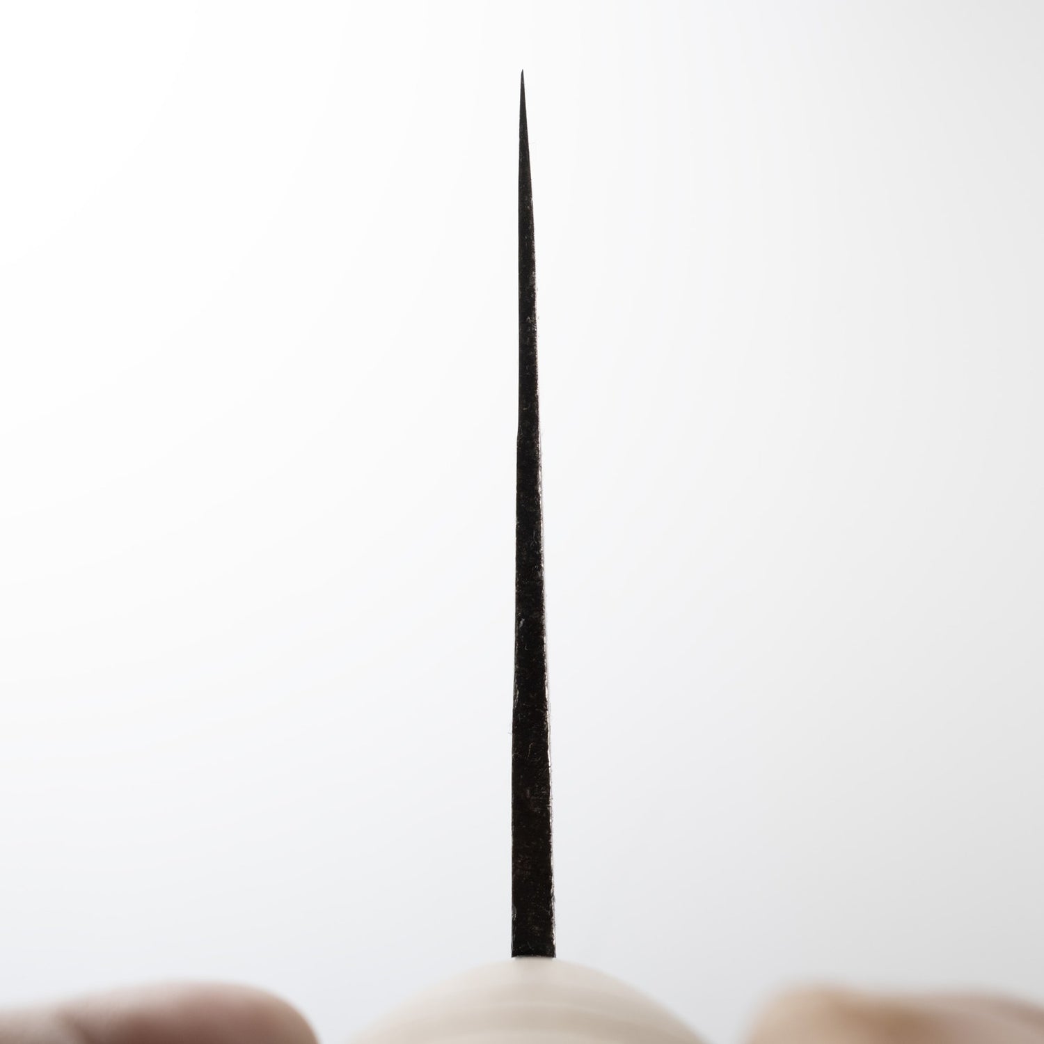這款先端系列是我們針對市場空缺的解答,也是本店唯一一把在中國鍛造、但採用日本日立藍二號碳鋼芯、不鏽鋼夾層的刀具。鍛造厚刀背將大部分重量集中於手柄軸線上,賦予中式菜刀一貫的沉穩手感。刀身在靠近刃口處迅速變薄,使這款寬刃刀在旋轉時顯得格外輕盈——這是多數日本製中式菜刀難以做到的。整體來說,這款鍛造刀身對於從小習慣使用中式菜刀的人來說,手感極佳。