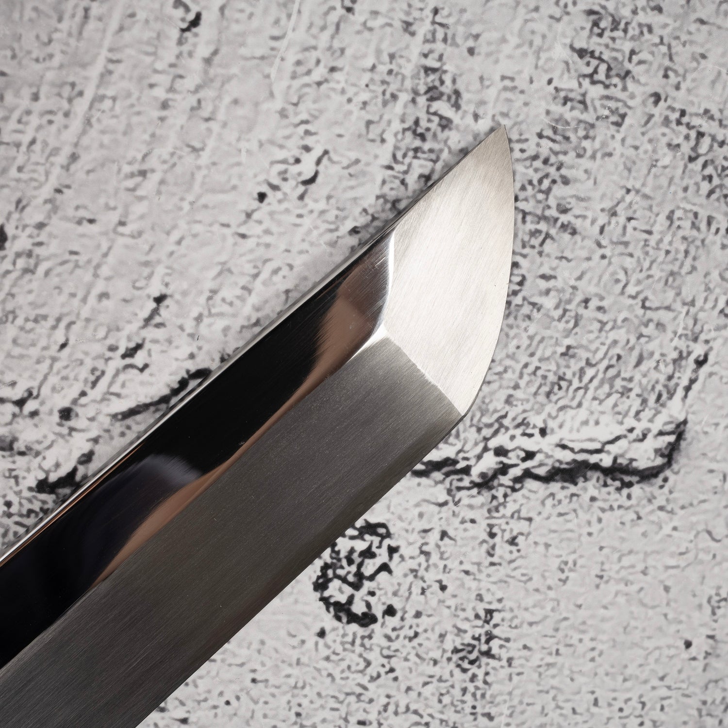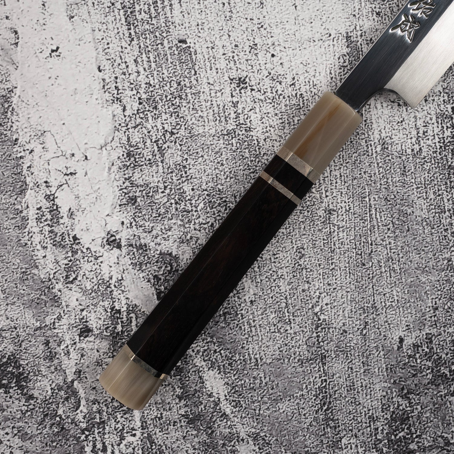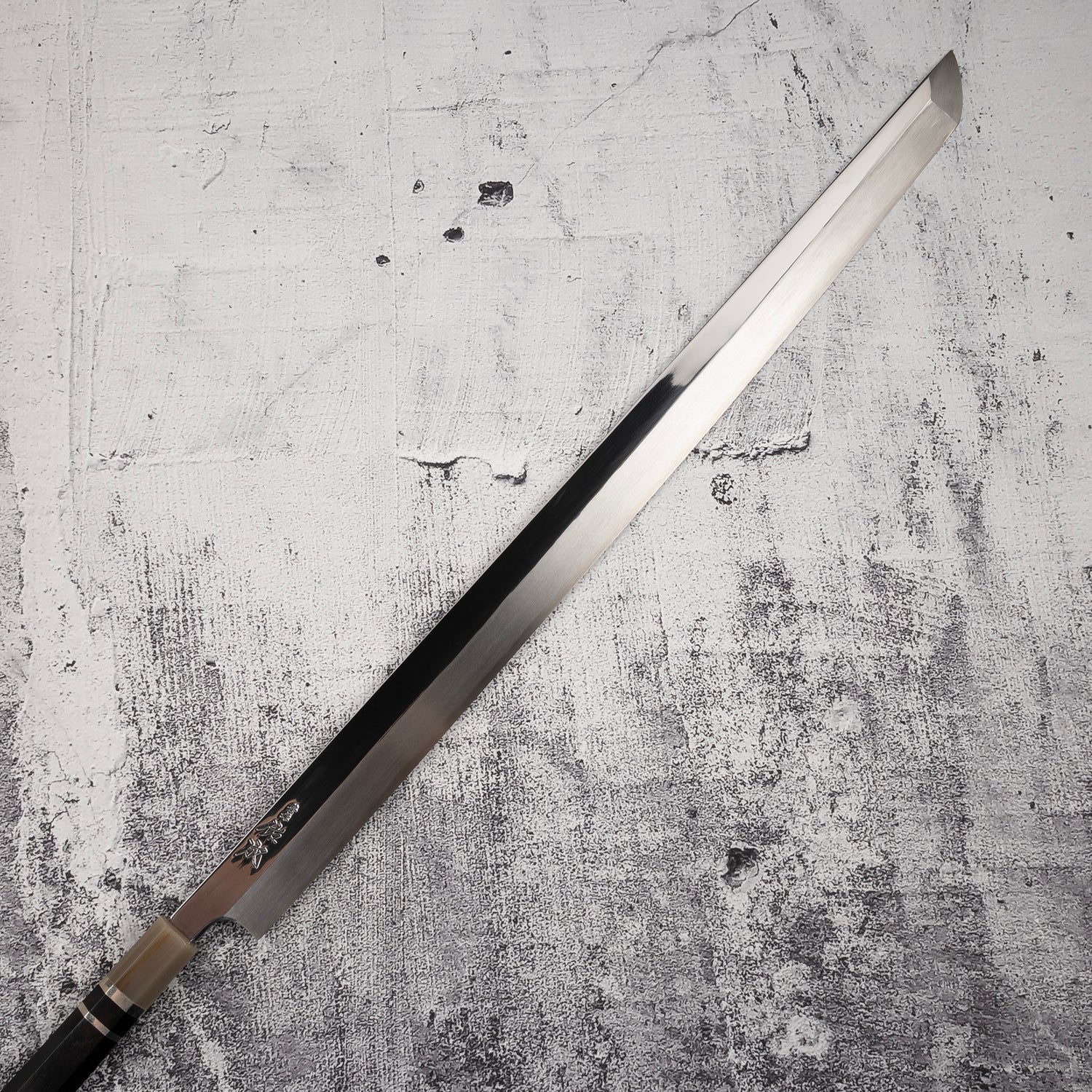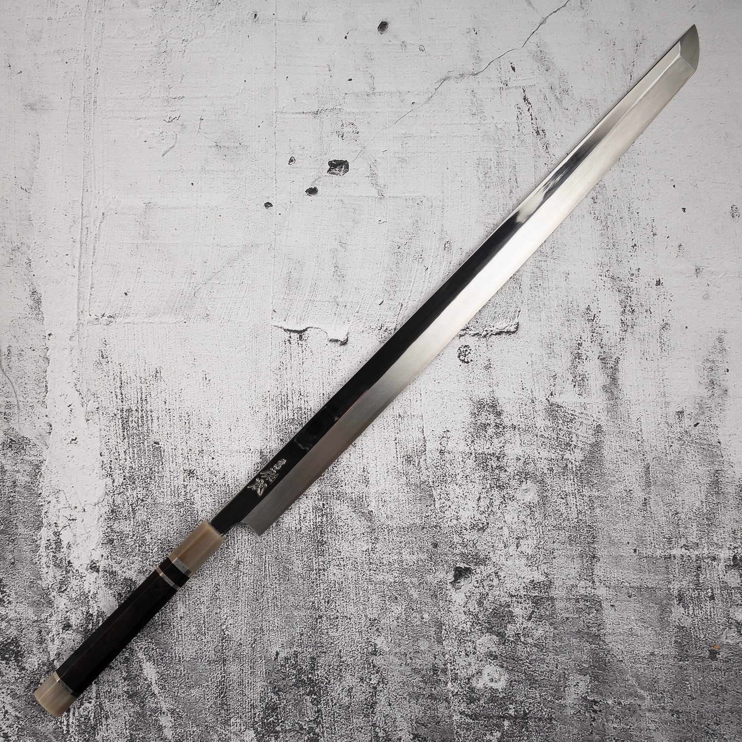 Extremely rare (I have only seen one!) Sukenari White 2 Maguro Kiri (Tuna Knife). The 540mm edge will definitely making it the true statement of your collection! This is a White 2 mirror polished Kasumi Maguro kiri.